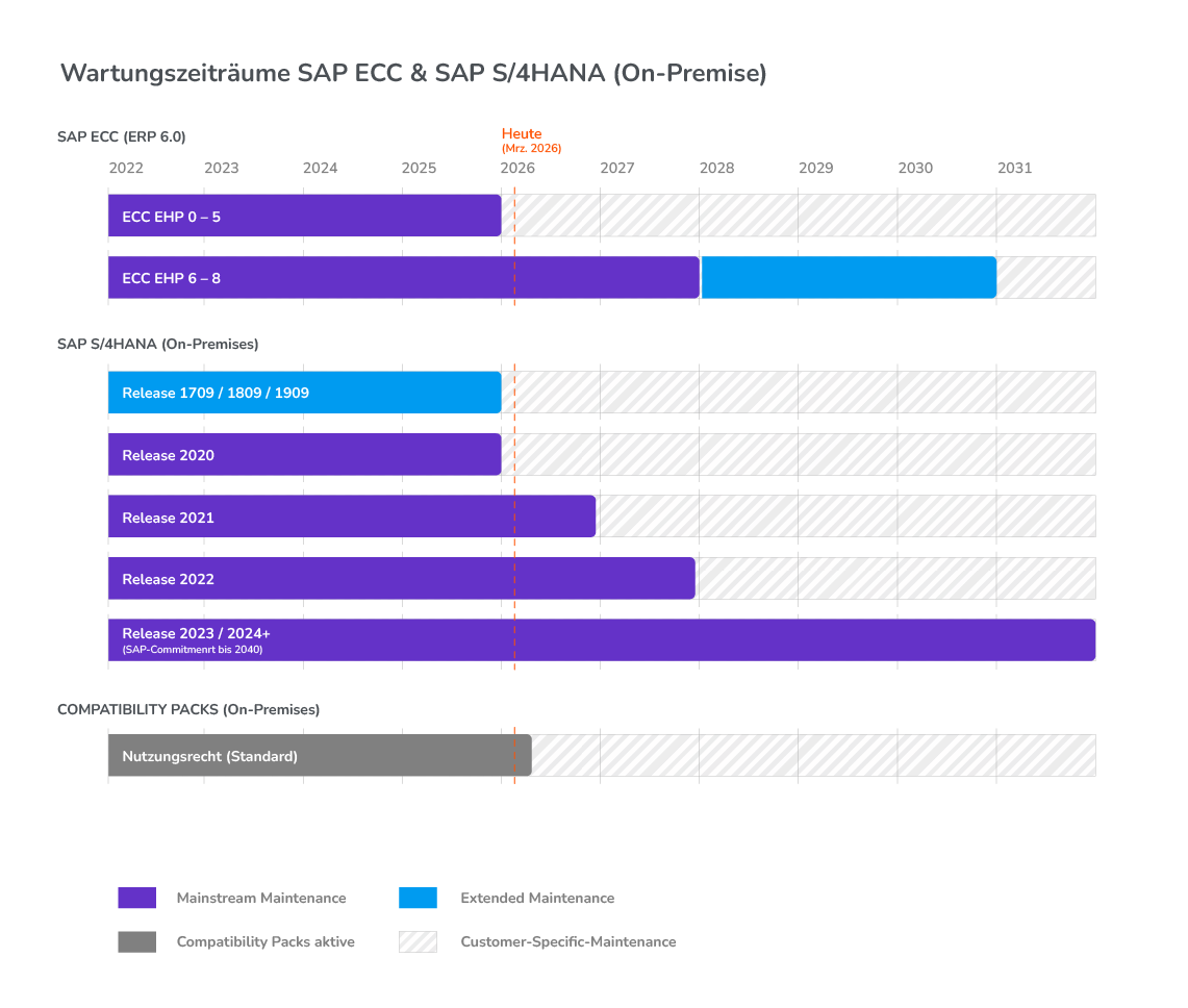 Nach dem Ende der jeweiligen Wartungsphase stellt SAP keine regulären Sicherheitsupdates, gesetzlichen Anpassungen oder funktionalen Weiterentwicklungen mehr bereit. Unternehmen wechseln dann in die sogenannte Customer Specific Maintenance – mit deutlich eingeschränktem Support, höherem Eigenaufwand und erhöhtem Risiko.