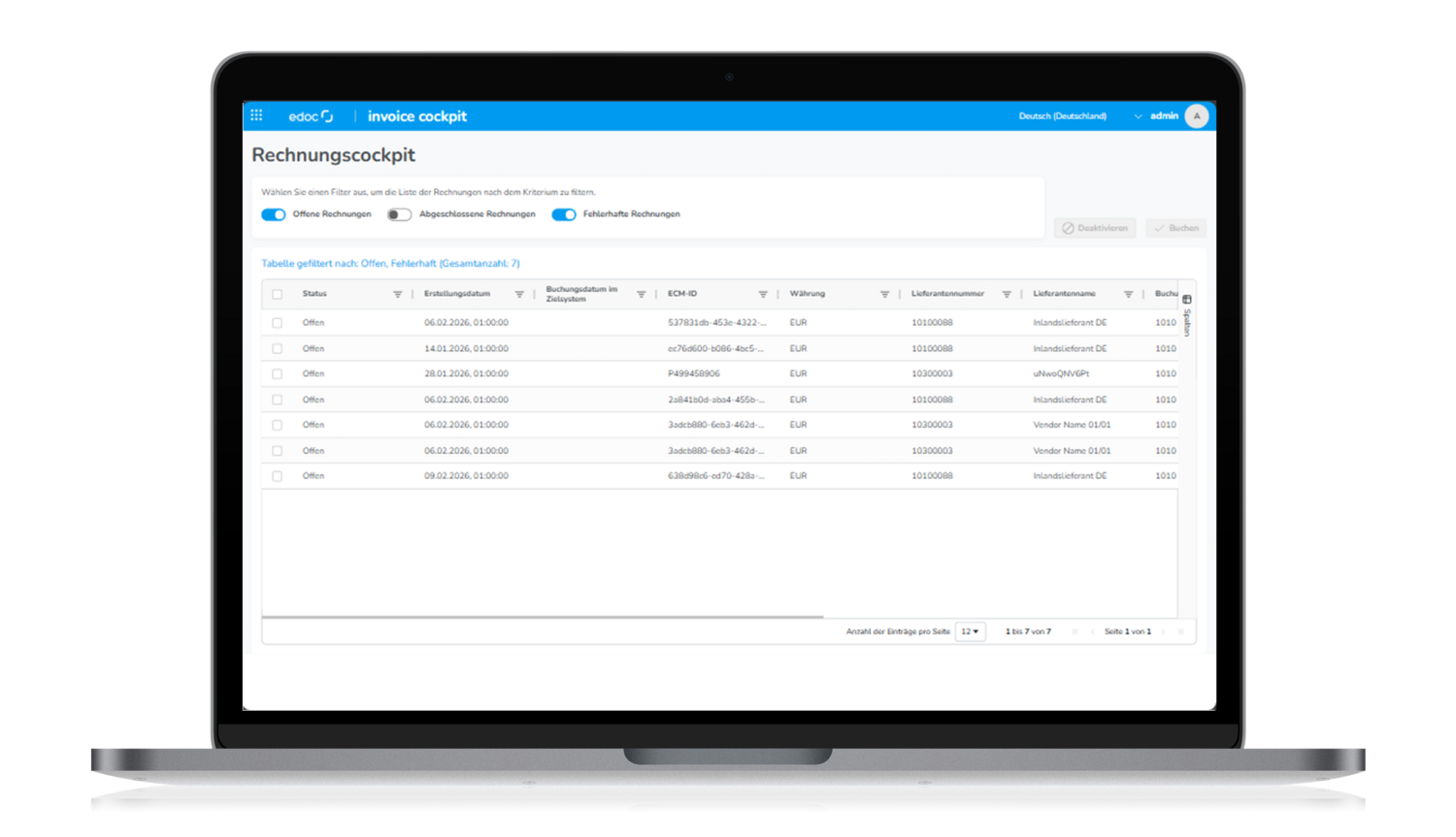 Im edoc invoice cockpit laufen alle abgeschlossenen Rechnungsprozesse zentral zusammen. Die Buchhaltung kann Rechnungen gesammelt im SAP Cloud ERP weiterverarbeiten – automatisch, manuell oder als Vorerfassung. Intelligente Statusanzeigen zeigen, welche Rechnungen buchungsbereit sind und wo es Klärungsbedarf gibt. Fehler bei der Übergabe an SAP werden transparent angezeigt und können gezielt erneut angestoßen werden.